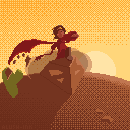 alush-ink @alush-ink big pokemon fan, casually creating digital art and tattoos breakdown: I made this one by dividing each element into a different layer with one key frame, i spread it onto 9 frames at 75miliseconds and changed each thing based on how light i want it to feel, so the dust changes each frame, the body and head moves up and down every 4/5 frames while the cloth every 1/2 frames, to give the character velocity i made cacti and rocks that change rapidly then tripled the frames and erased one cacti in later segments for a more various outcome.