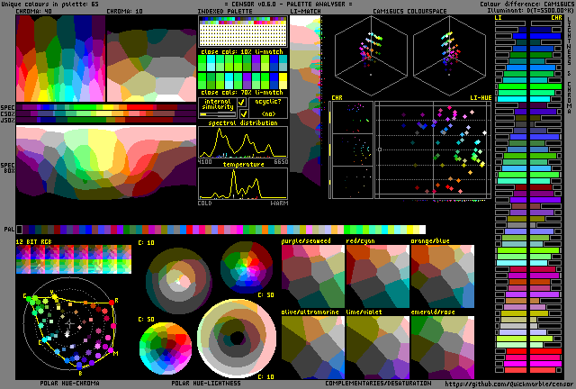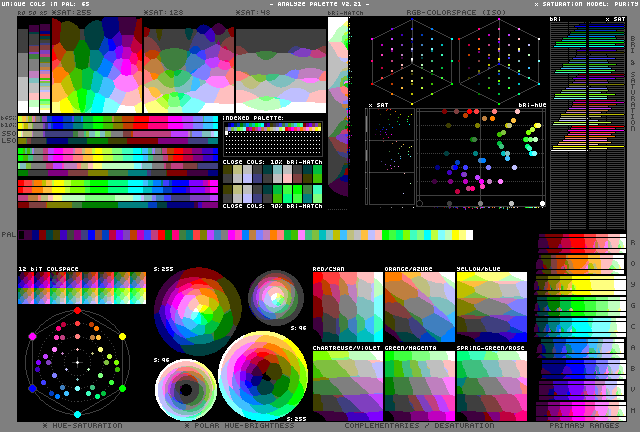 65 colors generated by building a 5x5x5 rgb cube of voxels and then removing every other voxel so that it forms a 3D chekerboard lattice. That results in 63 values, so 2 additional greyscale value are added at 25% and 75% to complete the greater diagonal.#5x5x5checkered on BSKY MSTDN INSTA X